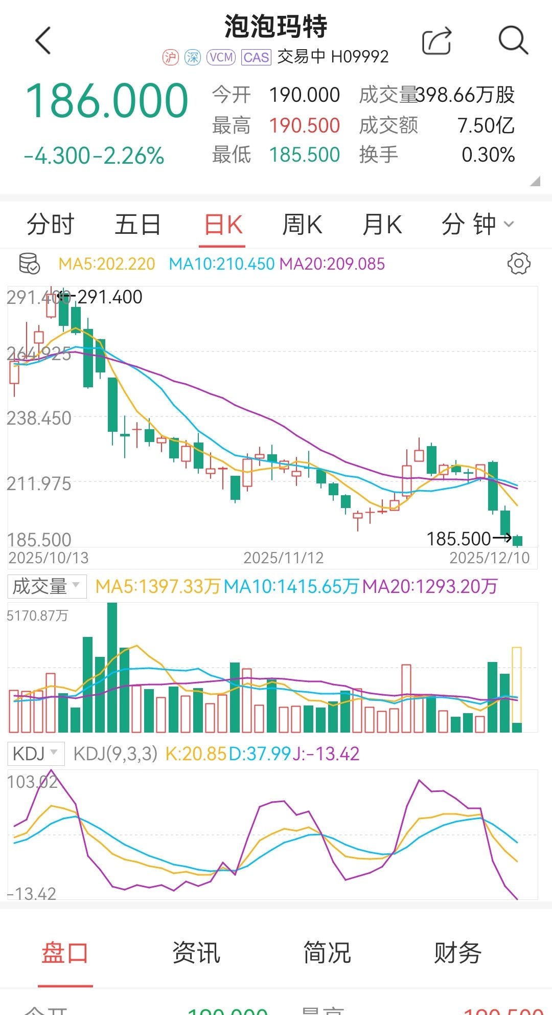 然而自12月8日起,泡泡瑪特開盤後股價迅速跳水,盤中持續下行,截至收盤跌幅接近8.5%,創下六週多以來的最大單日跌幅;而在12月9日,泡泡瑪特股價繼續大跌,截至今天12月10日目前已經相較上週大跌約14%,相比較全年最高點的339.8更是近乎腰斬。
