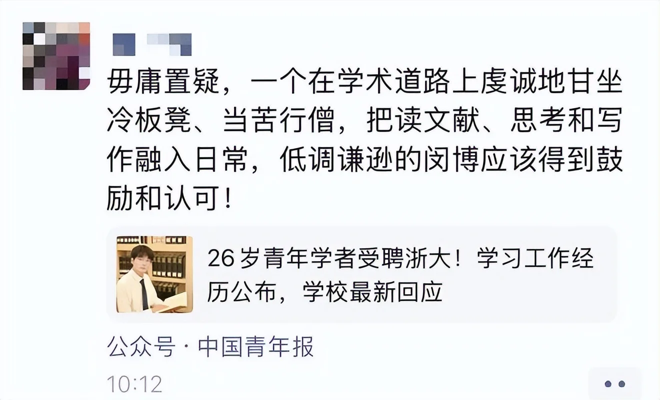 閔超受聘的消息引發熱議後,他曾經的一位老師在朋友圈轉發並評價道:“毋庸置疑,一個在學術道路上虔誠地甘坐冷板凳、當苦行僧,把讀文獻、思考和寫作融入日常,低調謙遜的閔博應該得到鼓勵和認可!”