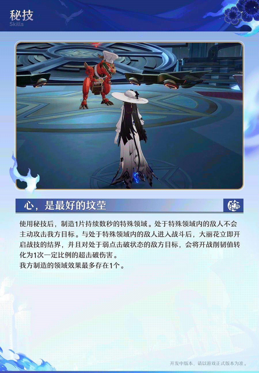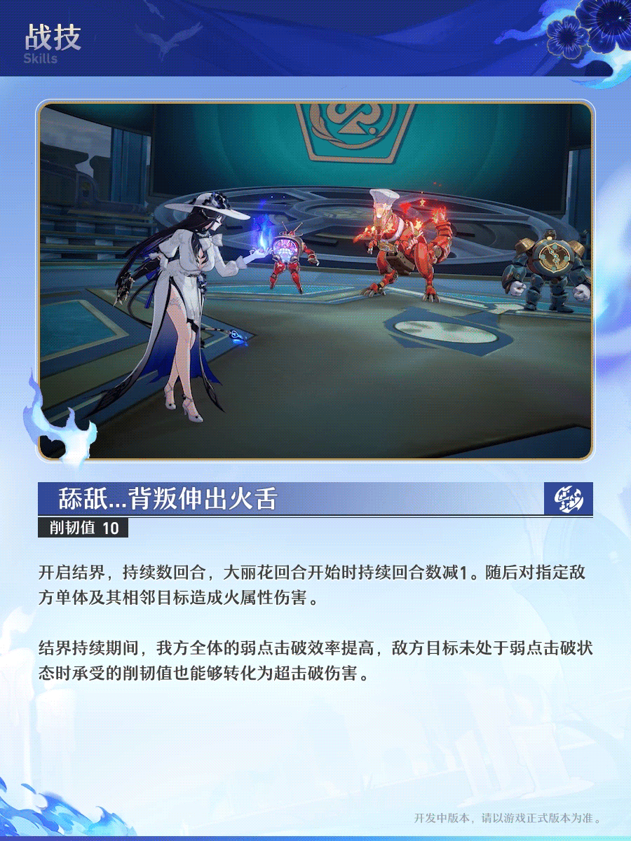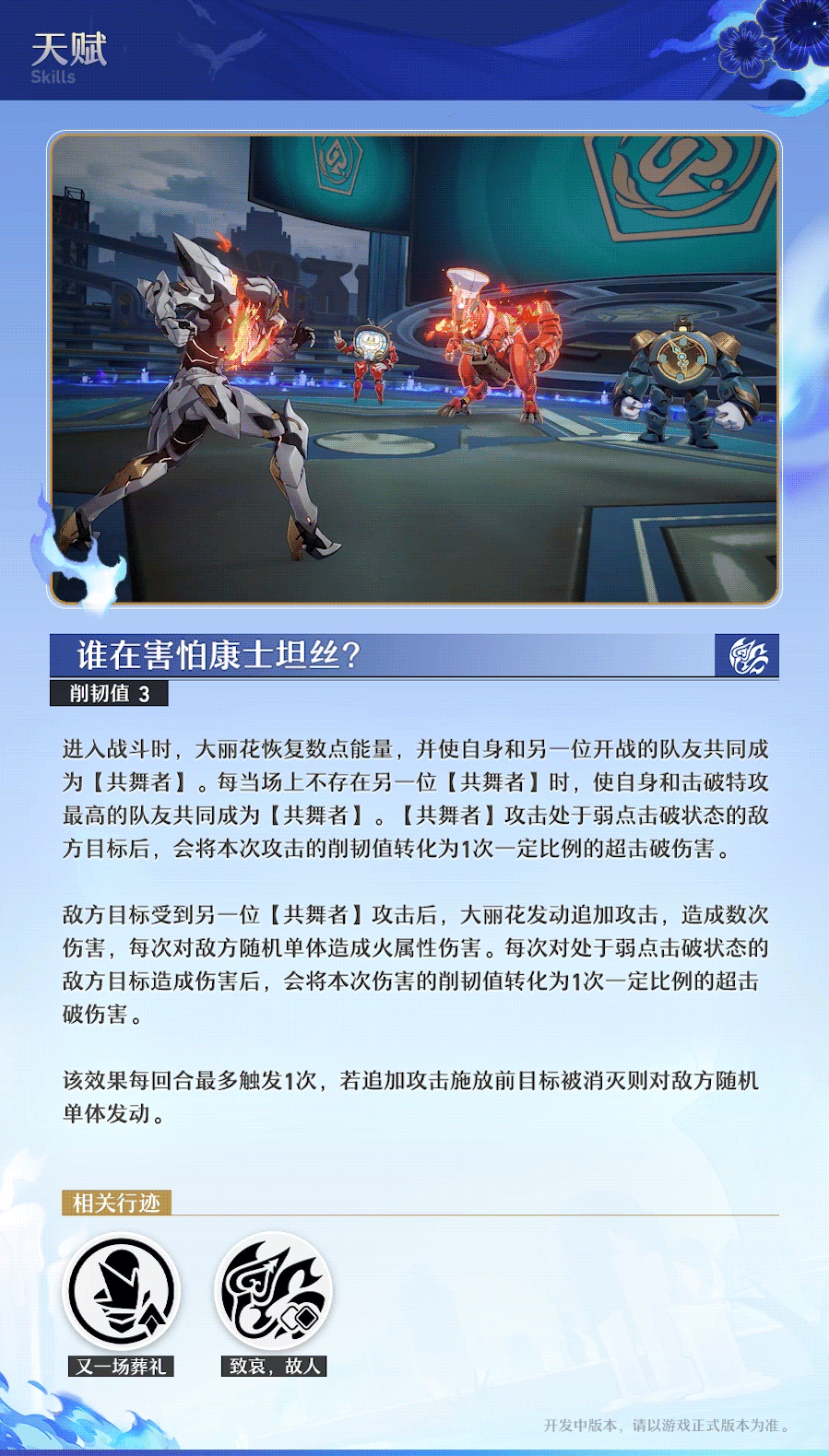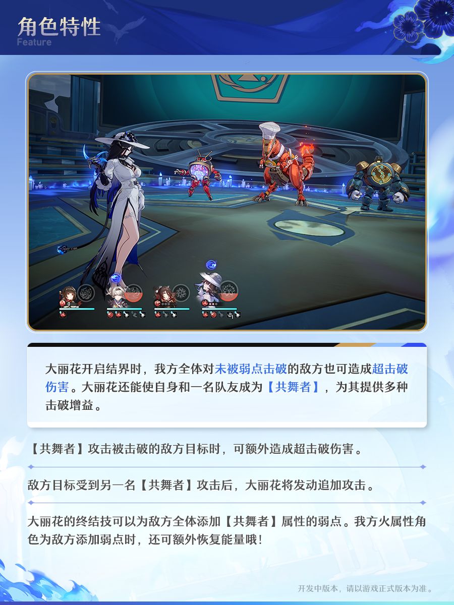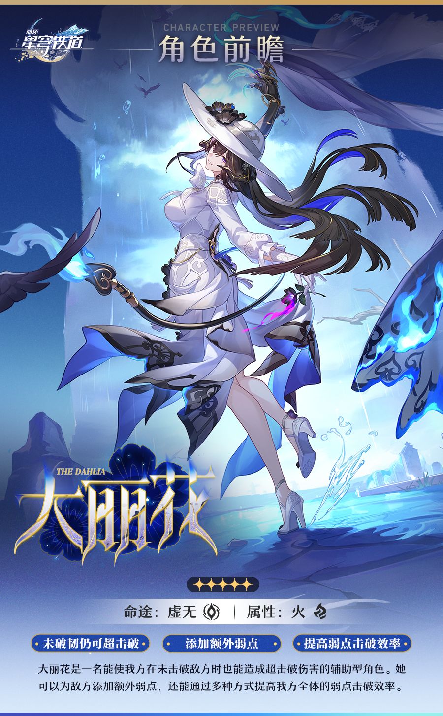 大麗花爲五星虛無火屬性角色,核心圍繞弱點擊破與超擊破傷害展開,能添加弱點,通過【共舞者】機制爲隊伍提供破韌和輸出增益,具體技能效果如下: