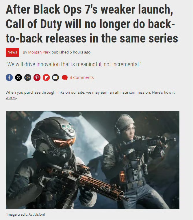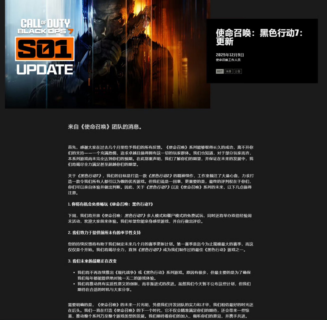这一决策背后,与2025年新作《黑色行动7》的市场表现不佳直接相关。官方在声明中坦言,部分玩家对该作未达预期,同时感谢玩家群体的反馈与支持,并承诺将“竭尽全力满足甚至超越玩家期望”。
