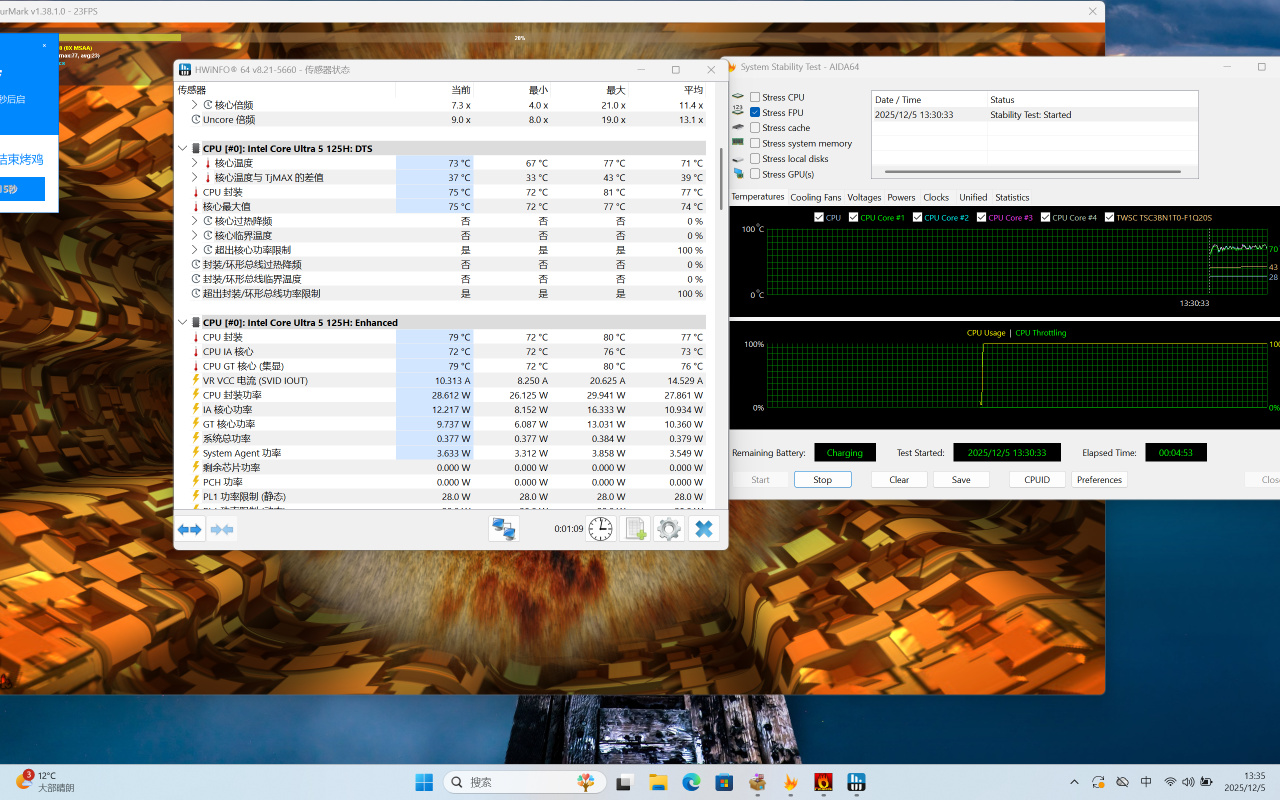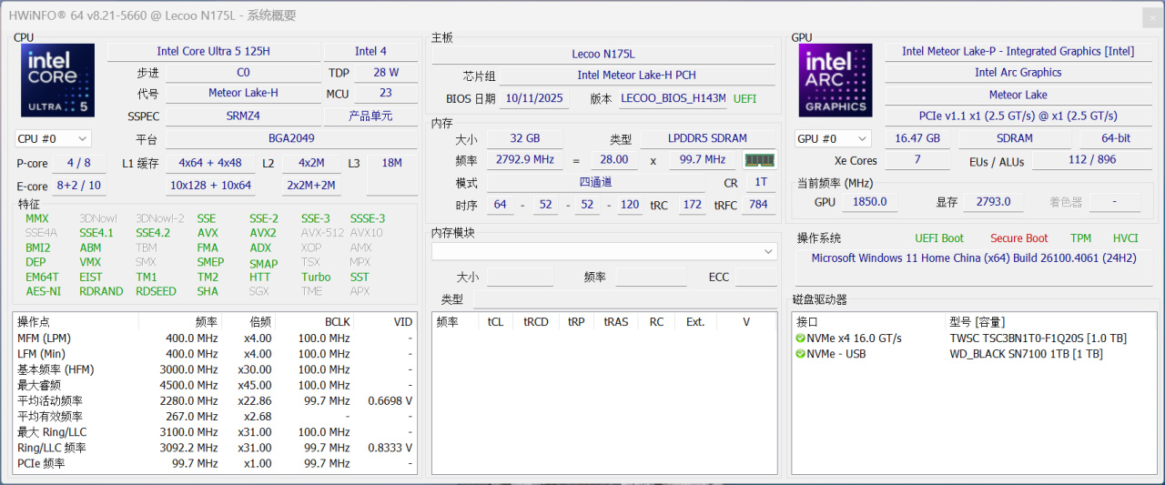 核心配置方面,CPU給到Ultra5-125H,雖然說能耗比沒有AMD現在的馬甲U那麼驚豔,但在這個價位段我是能接受的。畢竟它的TDP也就給到28W,主打的就是一個保守。