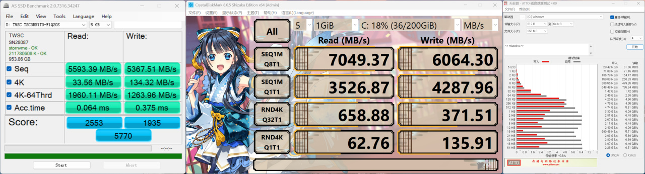順序讀寫速度很快,能跟高端PCIe4.0硬盤打的有來有回,就是4K隨機慢了點,應該是一塊QLC硬盤。其實我對它上QLC不大感冒,雖然後期直寫性能慢了點。