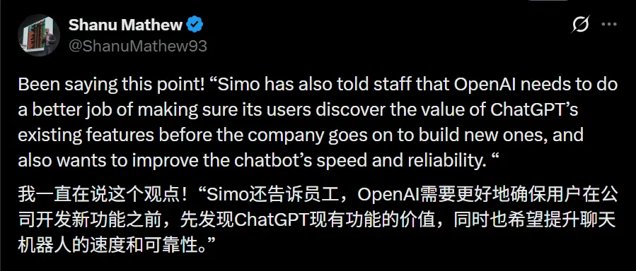 以產品負責人Fidji Simo爲代表的一派認爲,必須把資源投入到提升用戶體驗、速度和可靠性上。而研究人員則堅持認爲,公司應該優先考慮那些能實現超越人類思維能力的尖端技術,而不是去打磨一個聊天機器人。