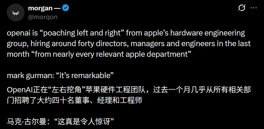 目前的智能手機在奧特曼看來,根本不適合承載未來的人工智能助手,爲了解決這個問題,OpenAI的新硬件團隊最近正在從蘋果公司大肆挖人。這不僅僅是人才的流動,更像是一種戰略上的圖窮匕見。