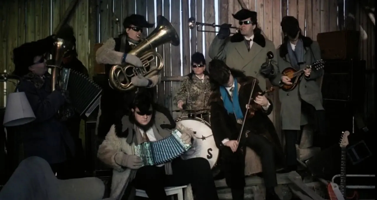 于是电影带着对双方的批判,用电影唤醒了这片即将滋润后朋克生长的土地上的一个家族乐队,他们自称列宁格勒牛仔,在西伯利亚的冻土地上穿着火箭靴、顶着飞机头,呐喊着、奏响着怪异的《草原啊草原》,但这份热情只能投射给村子里一个不会说话的哑巴。或许他们的艺术感对于那里的人们来说有些太超前,让他们始终无法找到一个合适而安定的出路去追寻梦想的尾流。