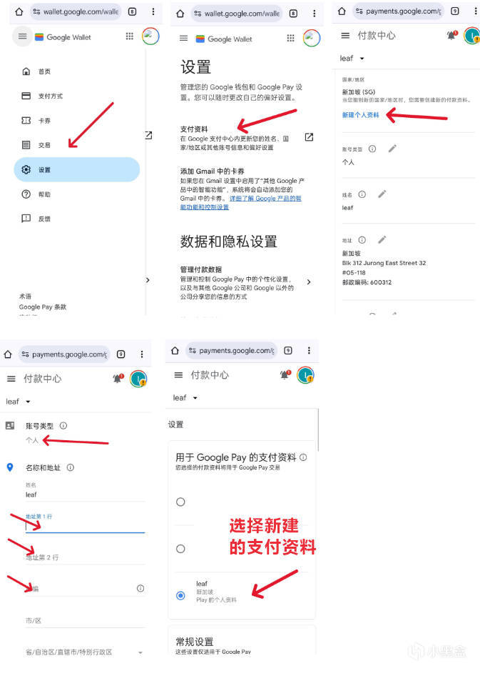 點擊地區板塊的新建資料按鈕,將支付資料的國家 / 地區設置爲新加坡(SG),賬號類型選擇 “個人”