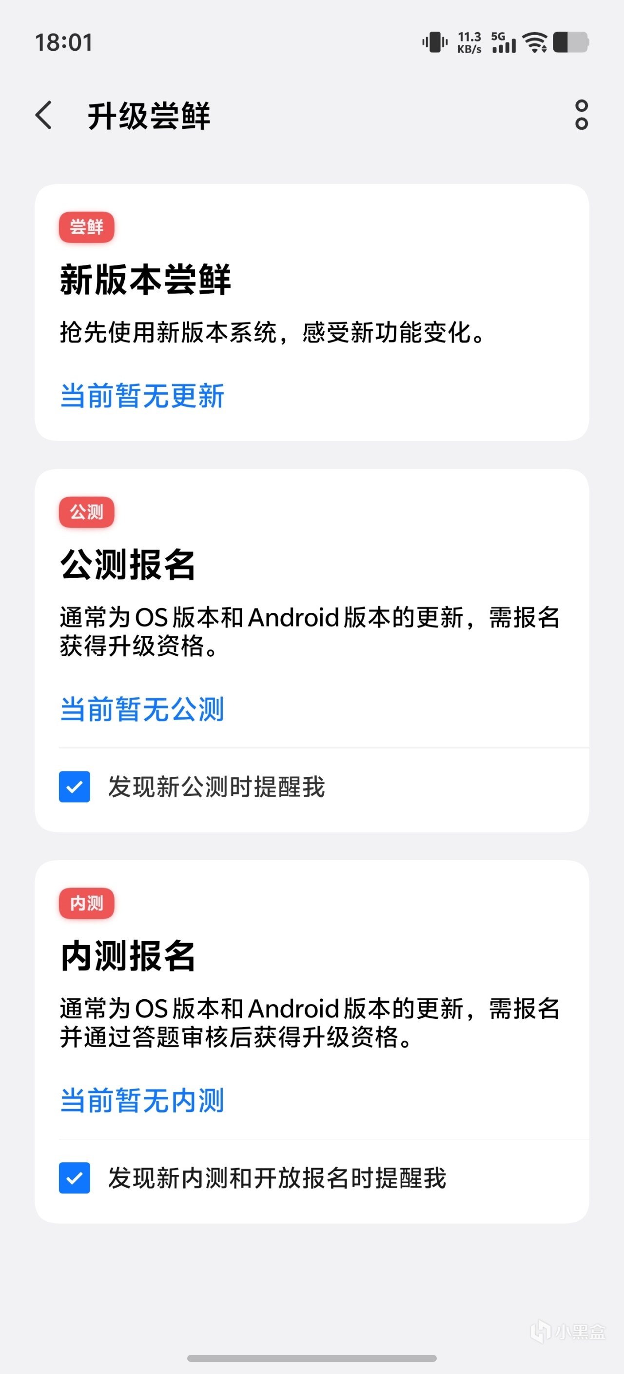 手中机型已经适配了OS 6的盒友们可以打开【设置】>【系统管理与升级】>【系统升级】>右上角选择【升级尝鲜】,报名参与公测