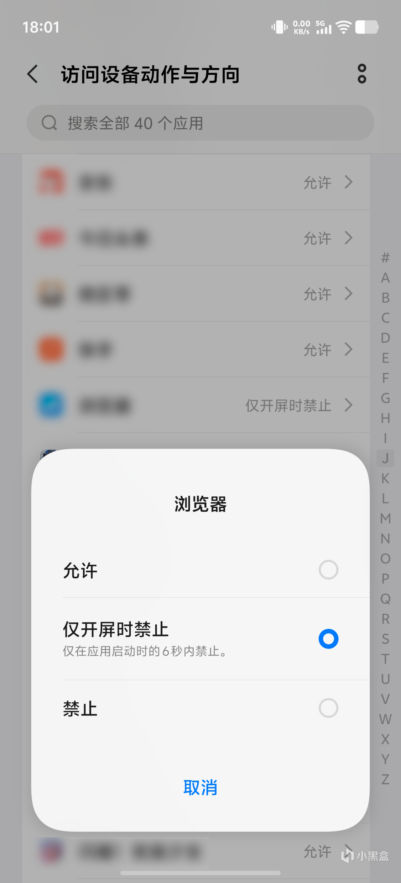话不多说,跟着我一起操作【隐私】>【权限管理】>【权限】>【访问设备动作与方向】,找到容易出现跳转到APP,打开【仅开屏时禁止】,这样开屏的6秒钟内,就不会因为摇动手机跳转了,而且也不会影响正常使用APP的任何功能,日常使用体验直接上一个台阶
