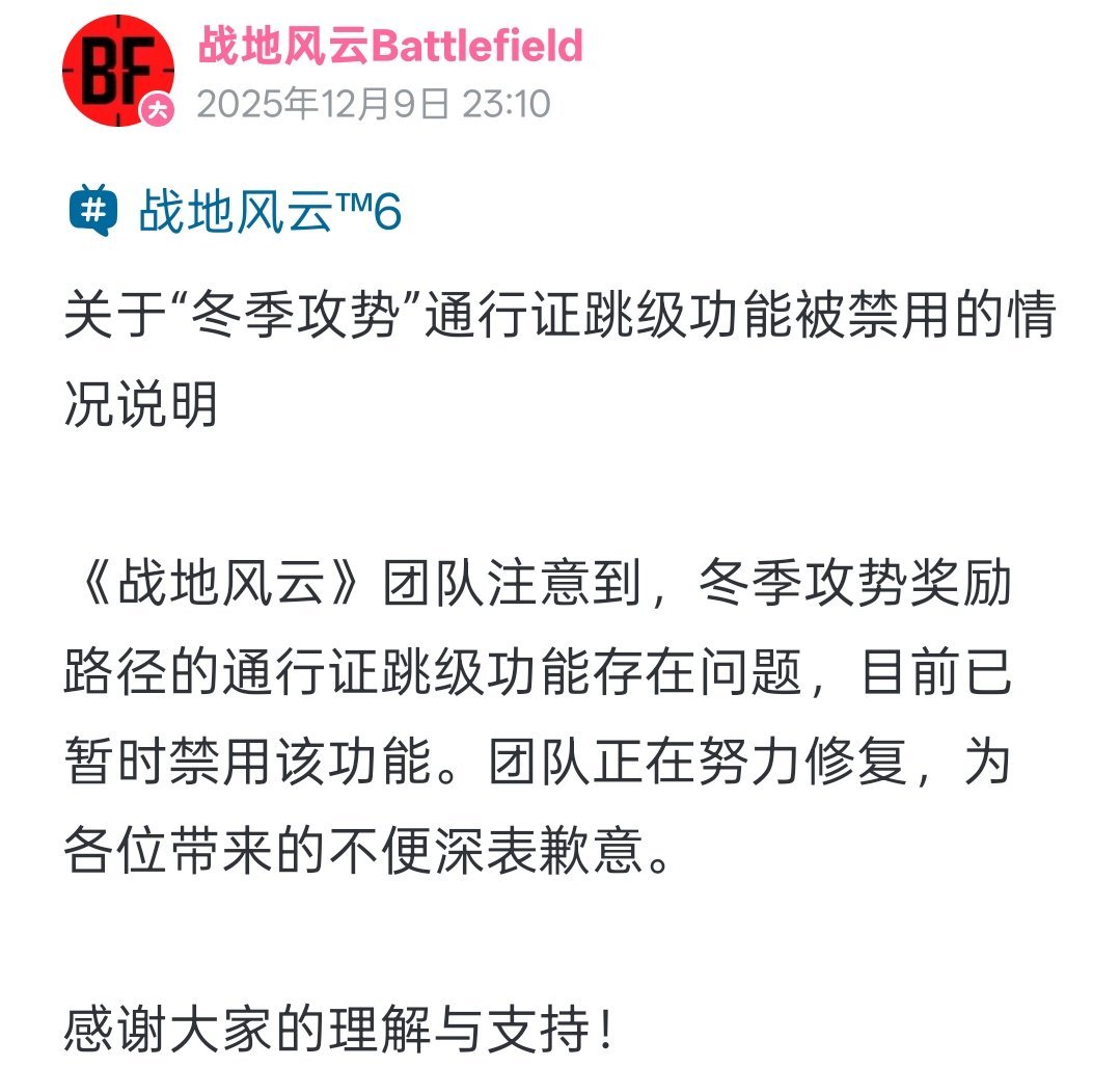 《战地6》在12月9日上线了1.1.3.0版本更新补丁,「冬季攻势」赛季活动内容也同步上线。