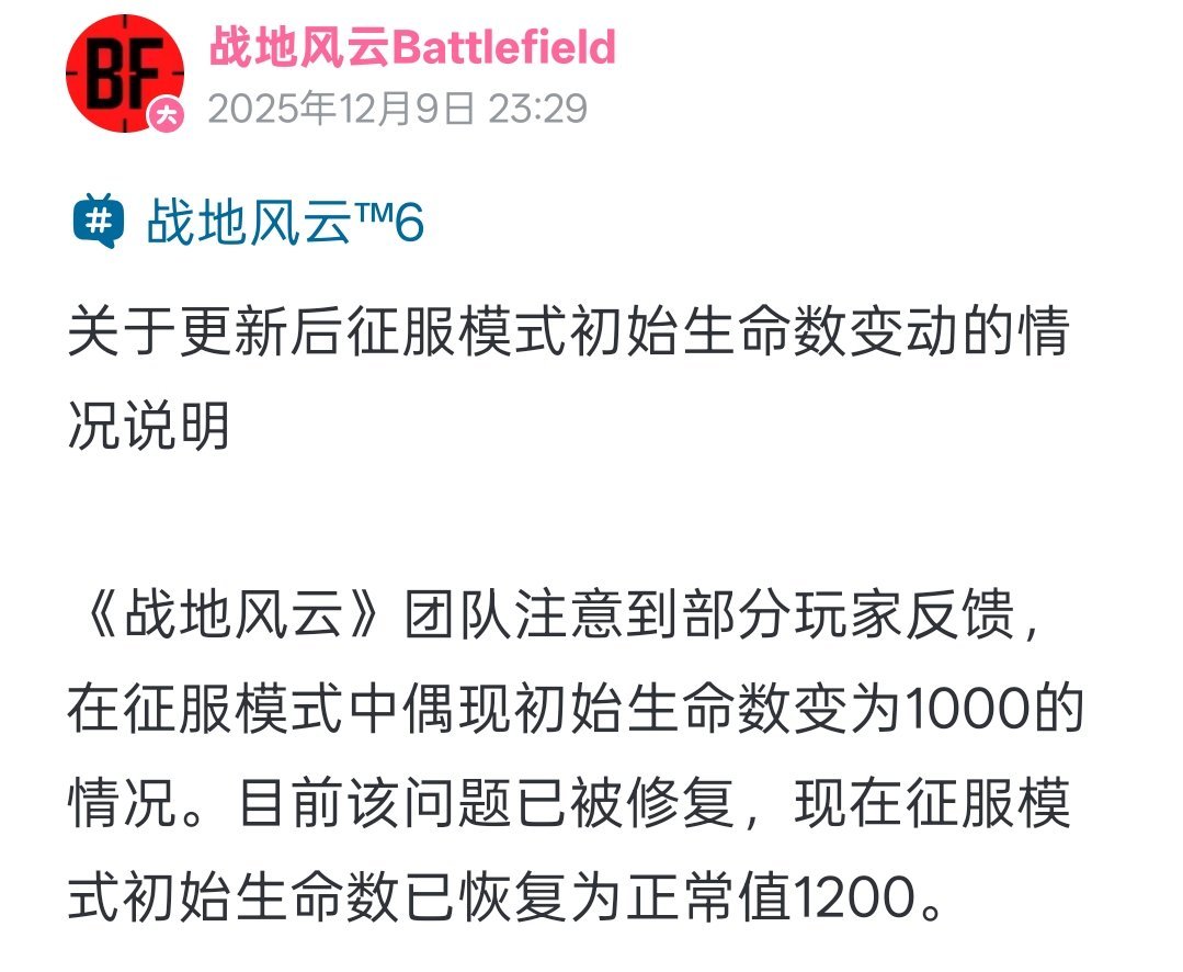 《战地风云》团队注意到部分玩家反馈,在征服模式中偶现初始生命数变为1000的情况。目前该问题已被修复,现在征服模式初始生命数已恢复为正常值1200。