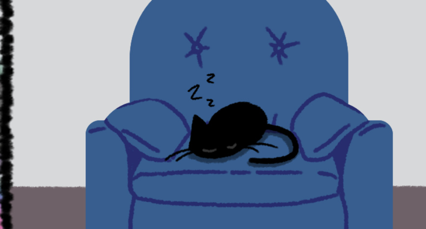 而撿回來的貓貓正在電視旁的沙發上昏昏欲睡,