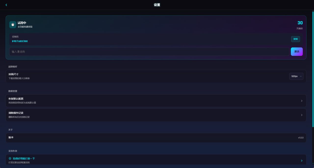回到首页点击设置,功能免费试用30天,不过5元的赞助费对于各位彦祖来说应该不是事儿,能支持一下试一下。同时设置界面也支持封面尺寸分辨率设置。