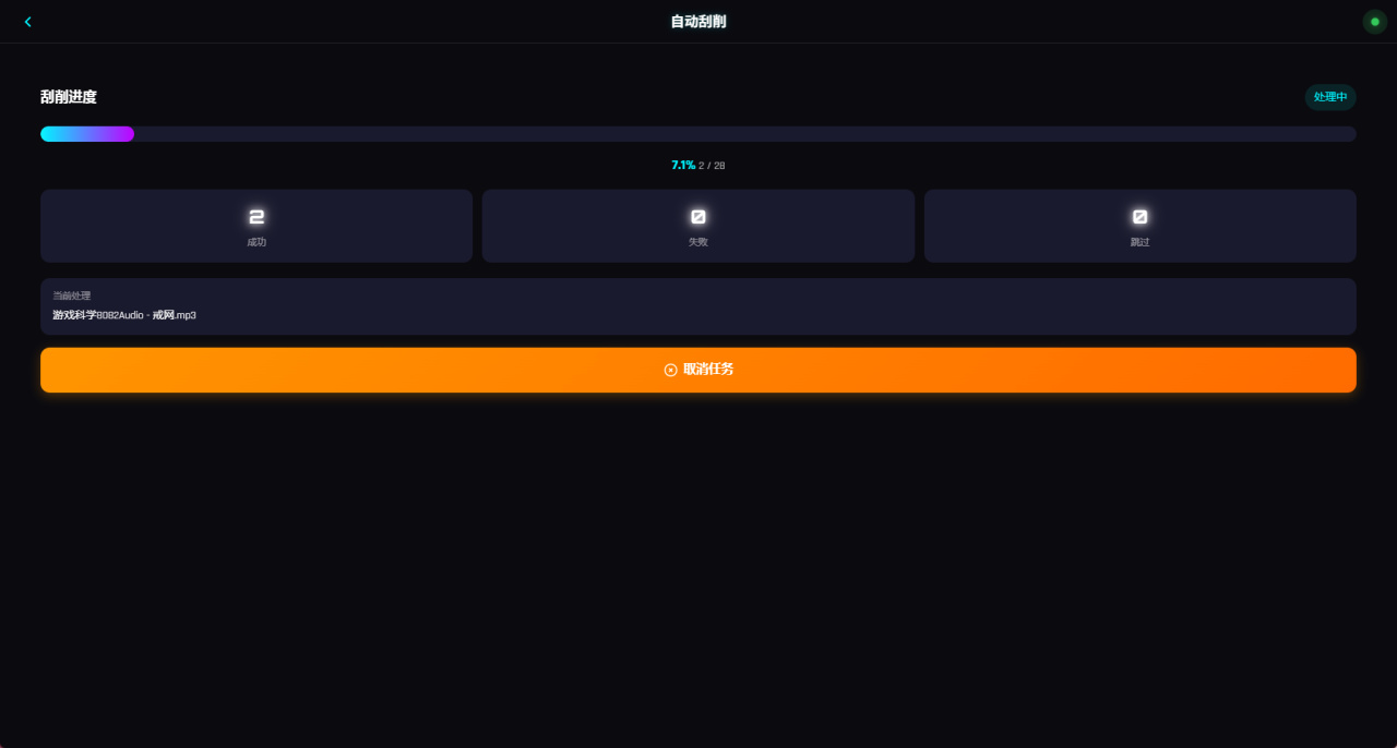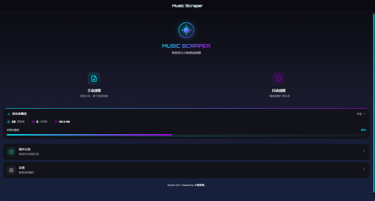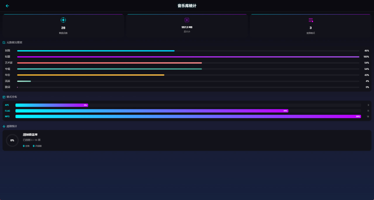 打开首页,整个界面是自适应的赛博朋克风,最近介绍的项目貌似蛮多都用这种基调。首页会展示当前音乐库的概述,音频资源的数量、刮削次数以及资源的总大小,下方进度条还会显示当前的封面完整度。