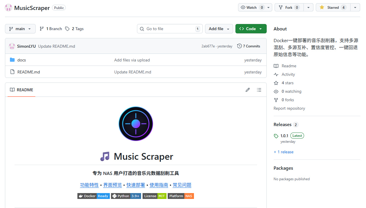 项目的文档地址为https://github.com/SimonLYU/MusicScraper,如果觉得项目对您用途不大,也可以去星标一下支持一下作者。