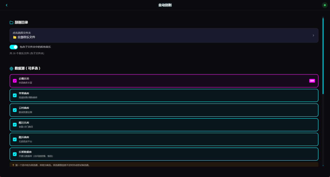 项目提供了手动刮削和自动刮削,首次直接添加音乐库直接用自动刮削就行,后续的音频资源添加就可以手动选择文件刮削。
