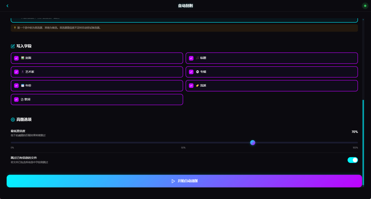 再往下则是写入字段设置,涉及到封面、标题、艺术家、专辑、年份、流派以及歌词,对于已经有信息的文件也可以选择跳过。