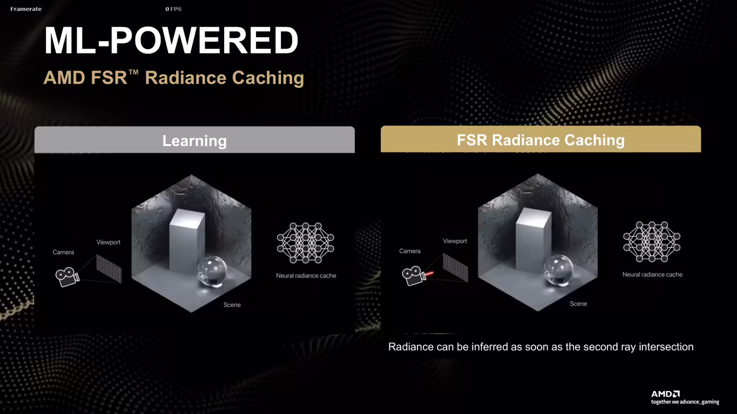 FSR 辐射缓存 (Radiance Caching):动态学习并预测光线在场景中的传播方式,从而高效实现实时全局光照。