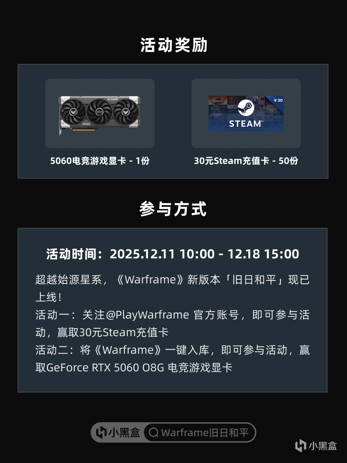 活动二:将《Warframe》一键入库(https://api.xiaoheihe.cn/store/roll_room_v2?award_id=5261),即可参与活动,赢取GeForce RTX 5060 O8G 电竞游戏显卡