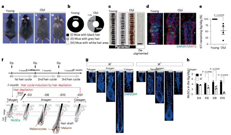 电离辐射导致干细胞分化成熟,并最终激活了细胞衰老相关的信号通路。结果,黑素干细胞储备在毛发生长周期内迅速耗竭,从而停止了成熟色素细胞的生成,最终导致白发。