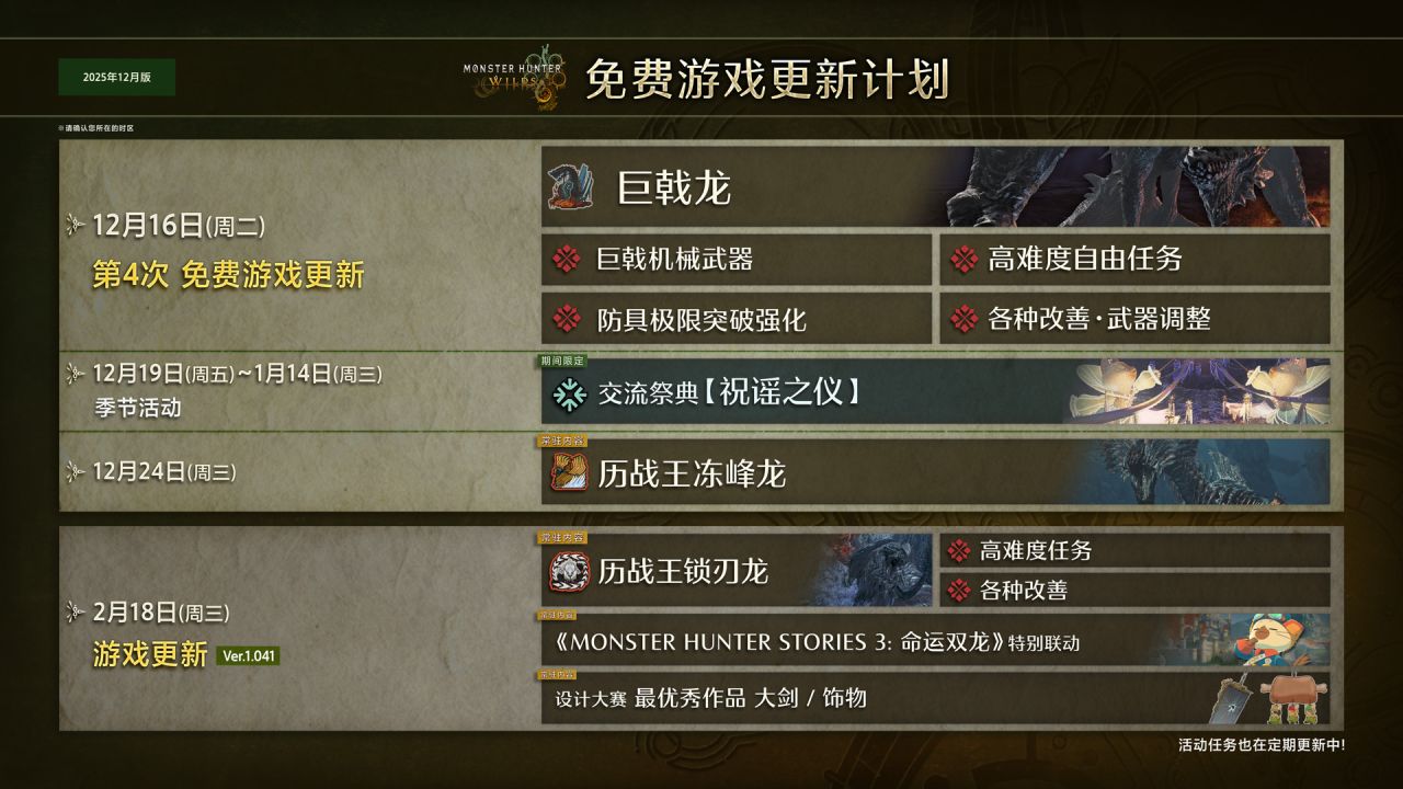 2.未来更新计划:官方确认将于2026年2月发布下一次免费更新,内容包括新的历战王等。同时,开发团队正积极根据玩家反馈进行游戏品质的优化与稳定性提升。