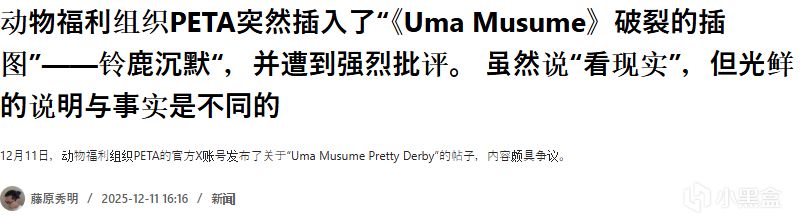 12月11日,國際動物保護組織PETA官方X賬號突然針對《賽馬娘 Pretty Derby》發文,配上一張沉默鈴鹿腿部骨頭刺穿皮膚的極端血腥插畫,稱“如果遊戲照搬現實,你喜歡的馬娘不會有復活故事,像現實中的沉默鈴鹿一樣,一次失誤就永遠結束”。此舉迅速引發日本玩家強烈反彈。