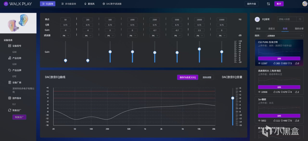 然後就是耳機的EQ功能,可以通過手機APP和PC的網頁端進行調整。並且耳機還自帶調音記憶功能,無論如何更換設備我們的設置都不會更改。而且如果你不會設置的話,在社區也有許多大神分享一些已經設置好的調音。而且還有職業選手同款設置,你只需要點擊就可以一鍵設置。