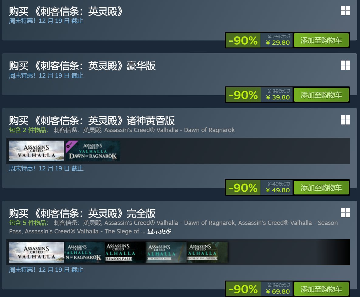 《刺客信条:英灵殿》迎来新史低 1 折,标准版售价¥29.8。