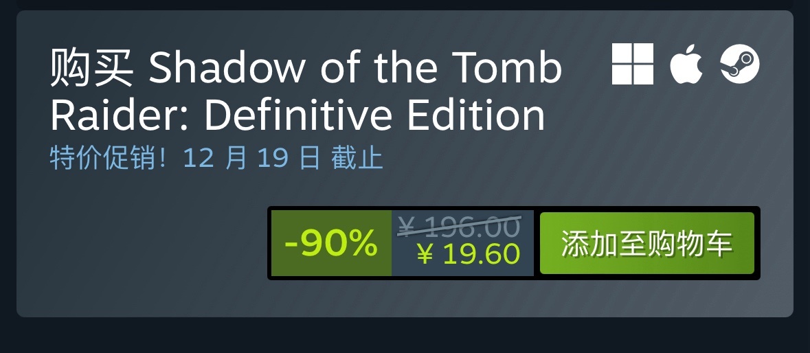 《古墓丽影:暗影》迎来新史低 1 折,标准版售价¥19.6。