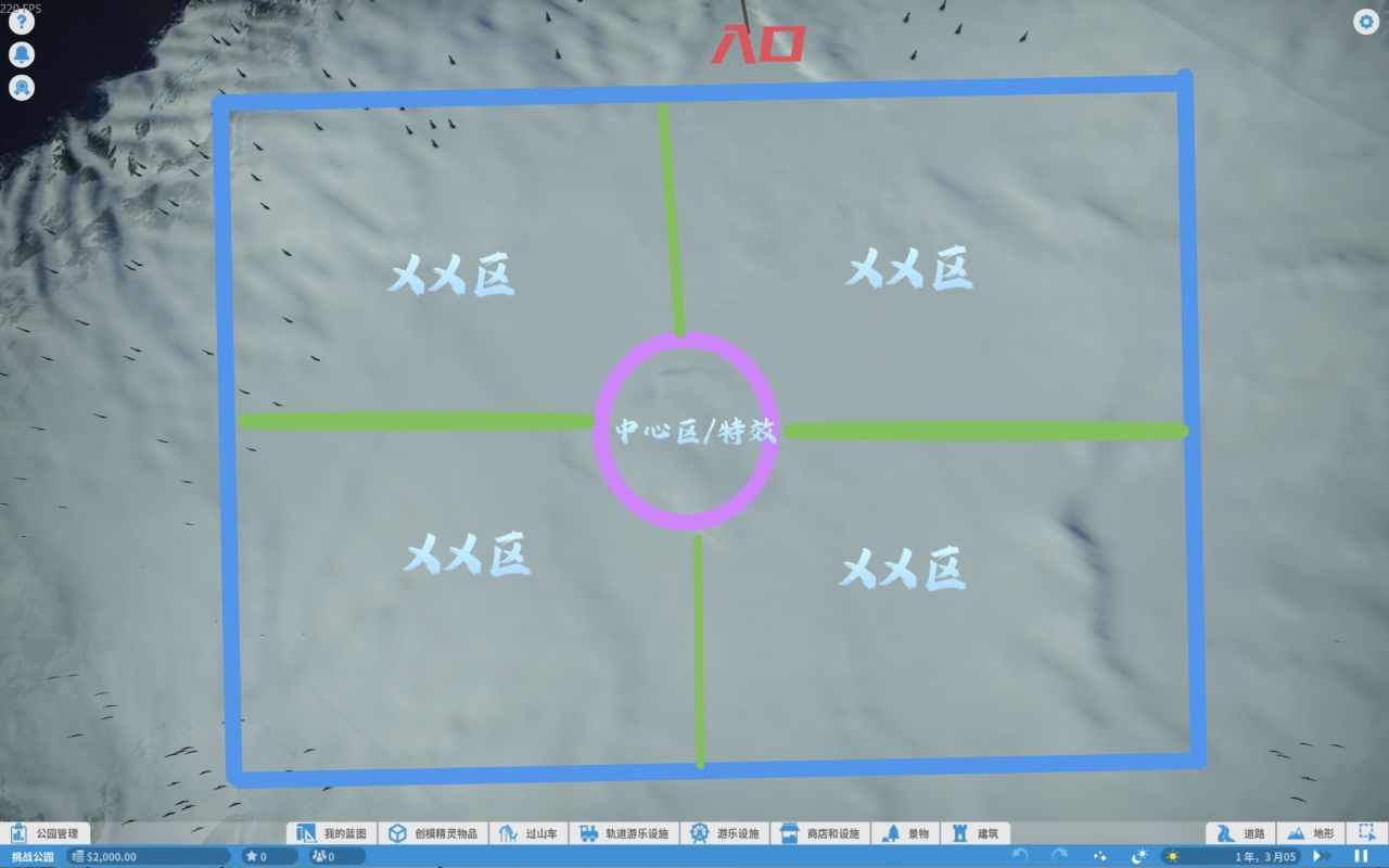 1.开局一定要做一个规划:大概要在中间预留一个空间,用来放烟花完成特定任务,而且可以循环导流,不至于出现游客堵死的问题
