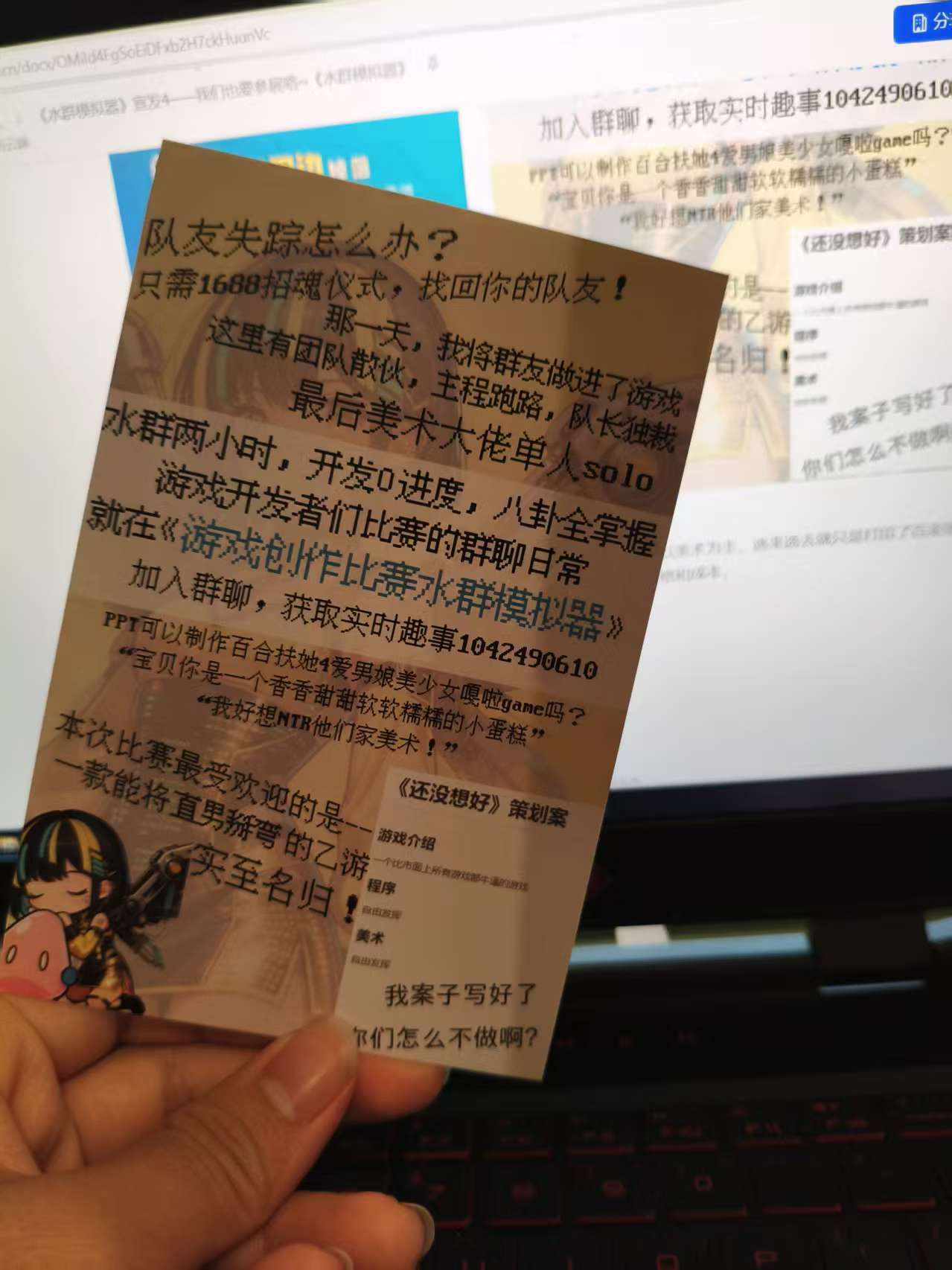 第一次参加,没什么经验,其实也没准备什么东西,加上我们游戏并不以美术为主,选来选去就只是打印了百来张明信片(pdd 单面,普通白卡,350克,百张30元)