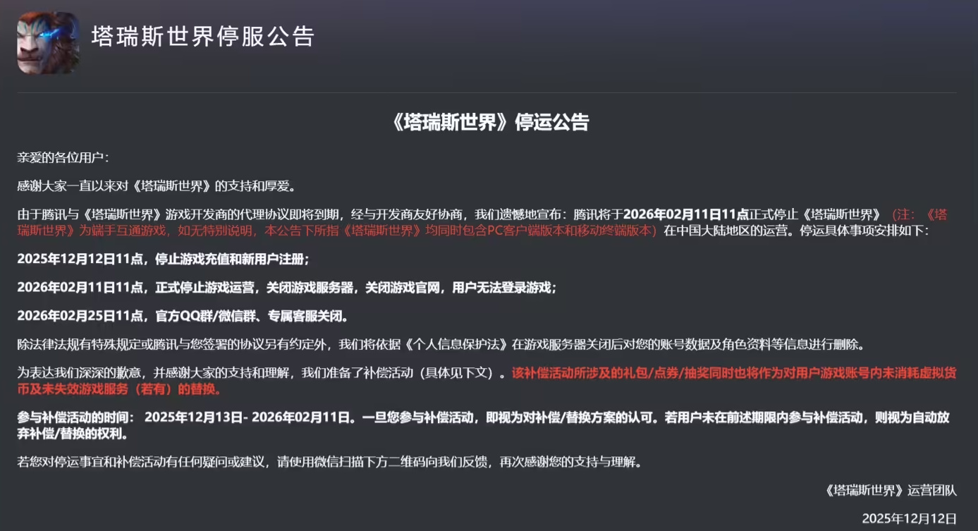 2025 年 12 月 12 日,腾讯运营团队的一则公告为《塔瑞斯世界》的国服旅程画上句号:因代理协议到期,这款曾对标《魔兽世界》的双端 MMORPG 将于 2026 年 2 月 11 日 17 点正式停运。从 2024 年 6 月抢先上线时的热度,到如今不足 18 个月便官宣谢幕,其兴衰轨迹折射出 MMO 赛道的残酷竞争法则。