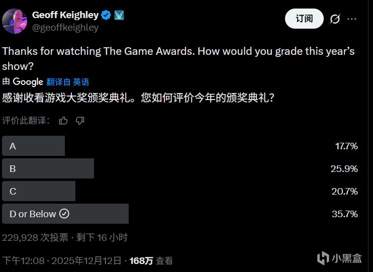 The Game Awards 2025 刚落幕,主持人 Geoff Keighley 在 X上立即发起观众打分投票,结果显示本届颁奖礼在观众中的口碑两极化——约 22 万票的样本中,选择“D 或更差”的票数占比最高,约为 35.7%。