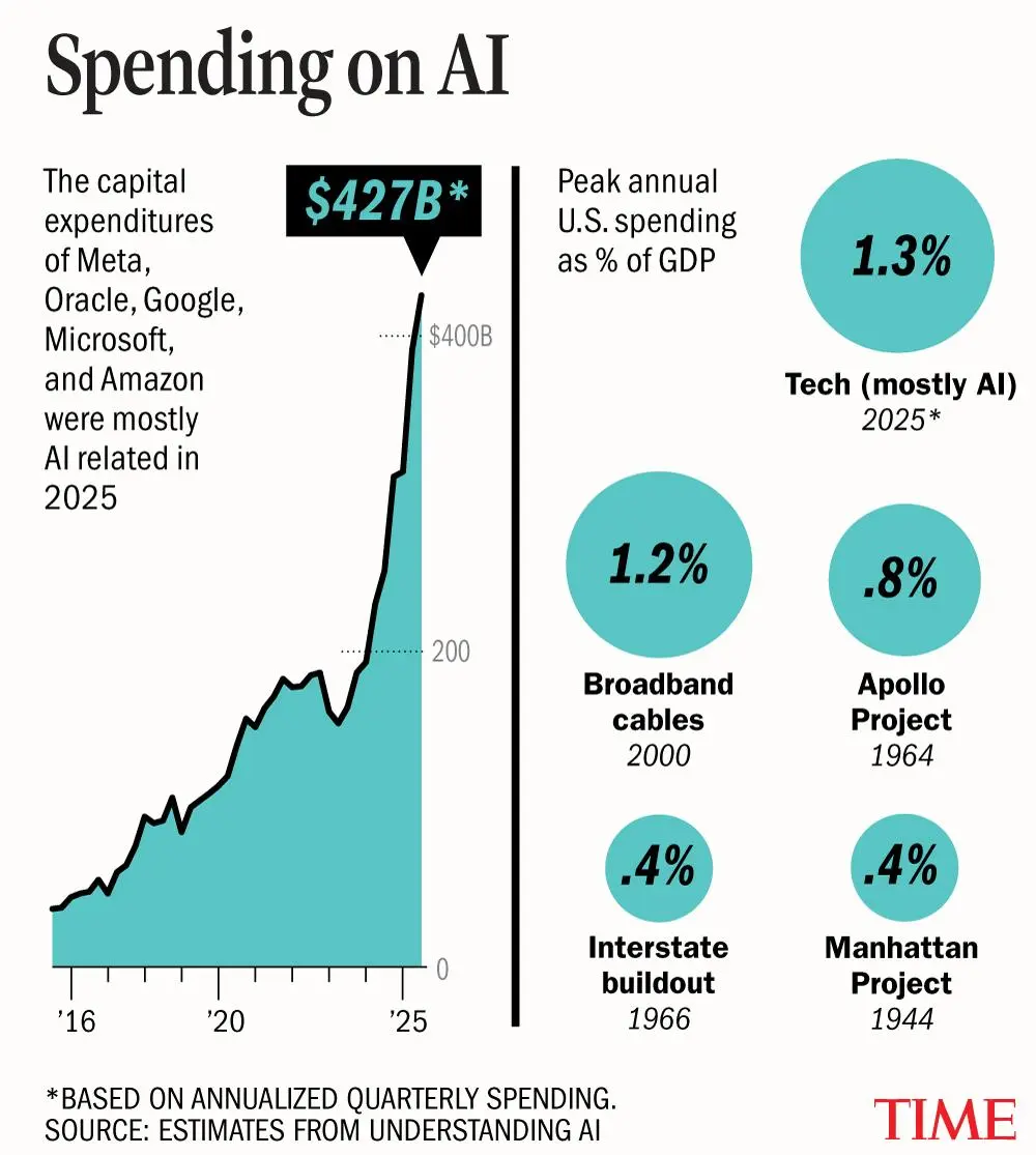 Meta、谷歌、微软、亚马逊这些巨头,光是在2025年的资本支出就达到了4270亿美元。这是什么概念?这比很多国家的GDP都要高。这笔钱几乎都流向了同一个地方:AI基础设施。