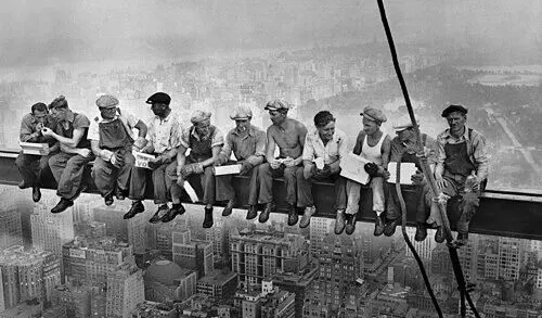 这可是摄影史上的重要作品之一,由 Charles C. Ebbets 拍摄,记录的是1932年11名钢铁工人在曼哈顿上空悬空的钢梁上吃饭,脚下是整个纽约。