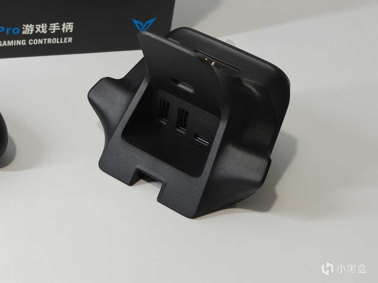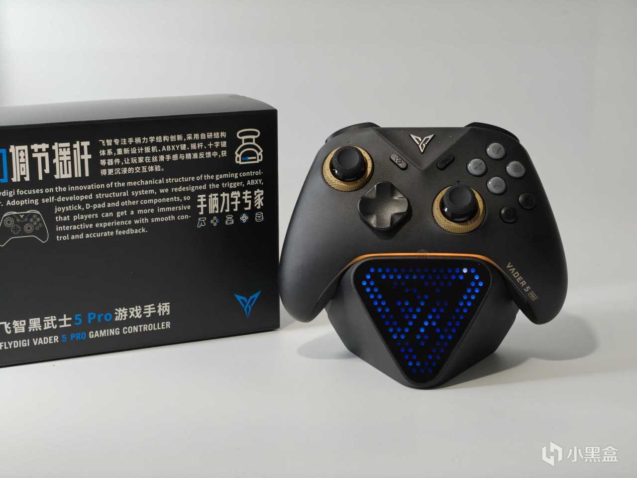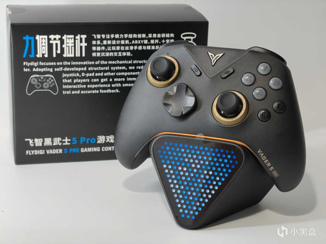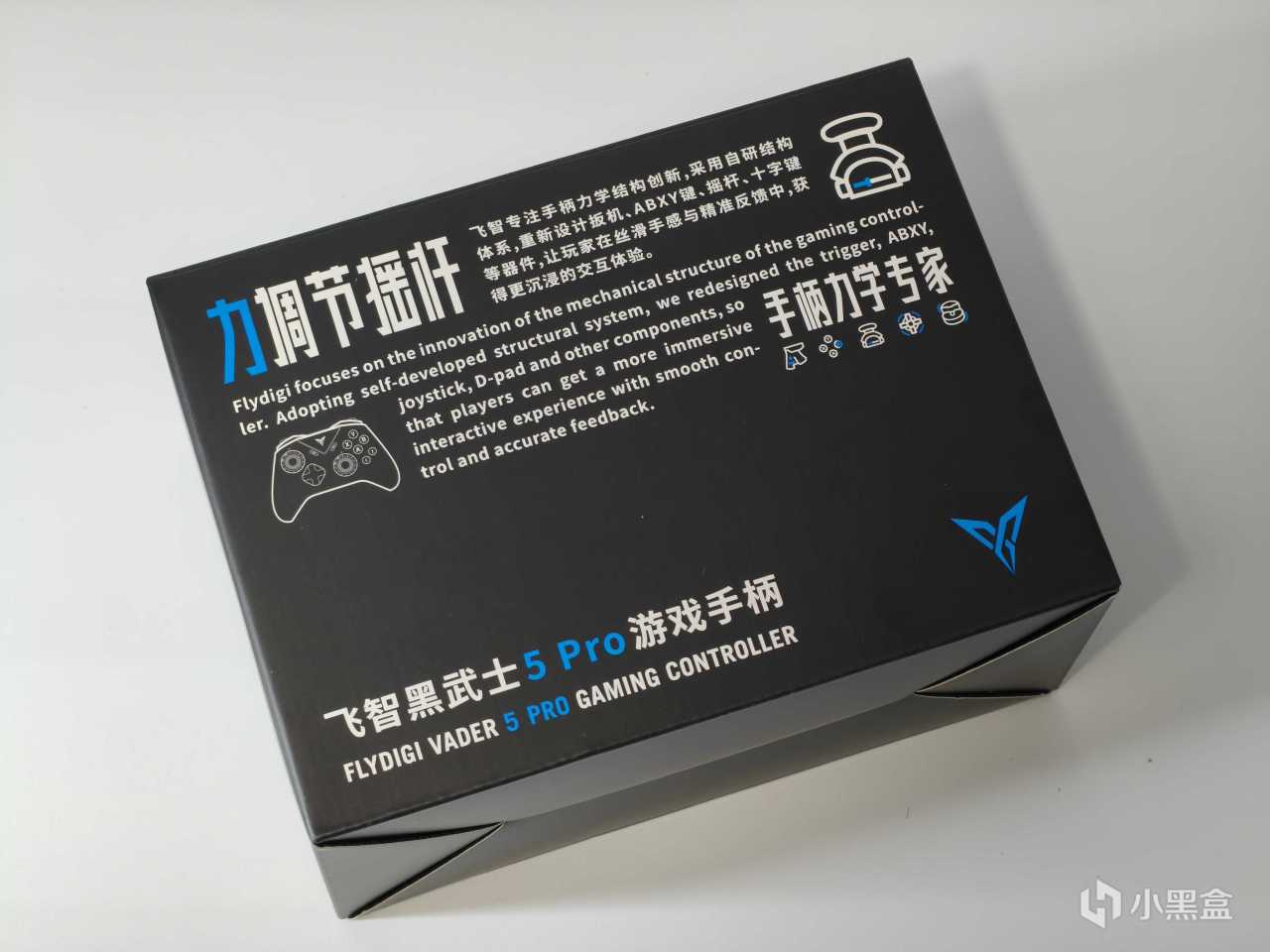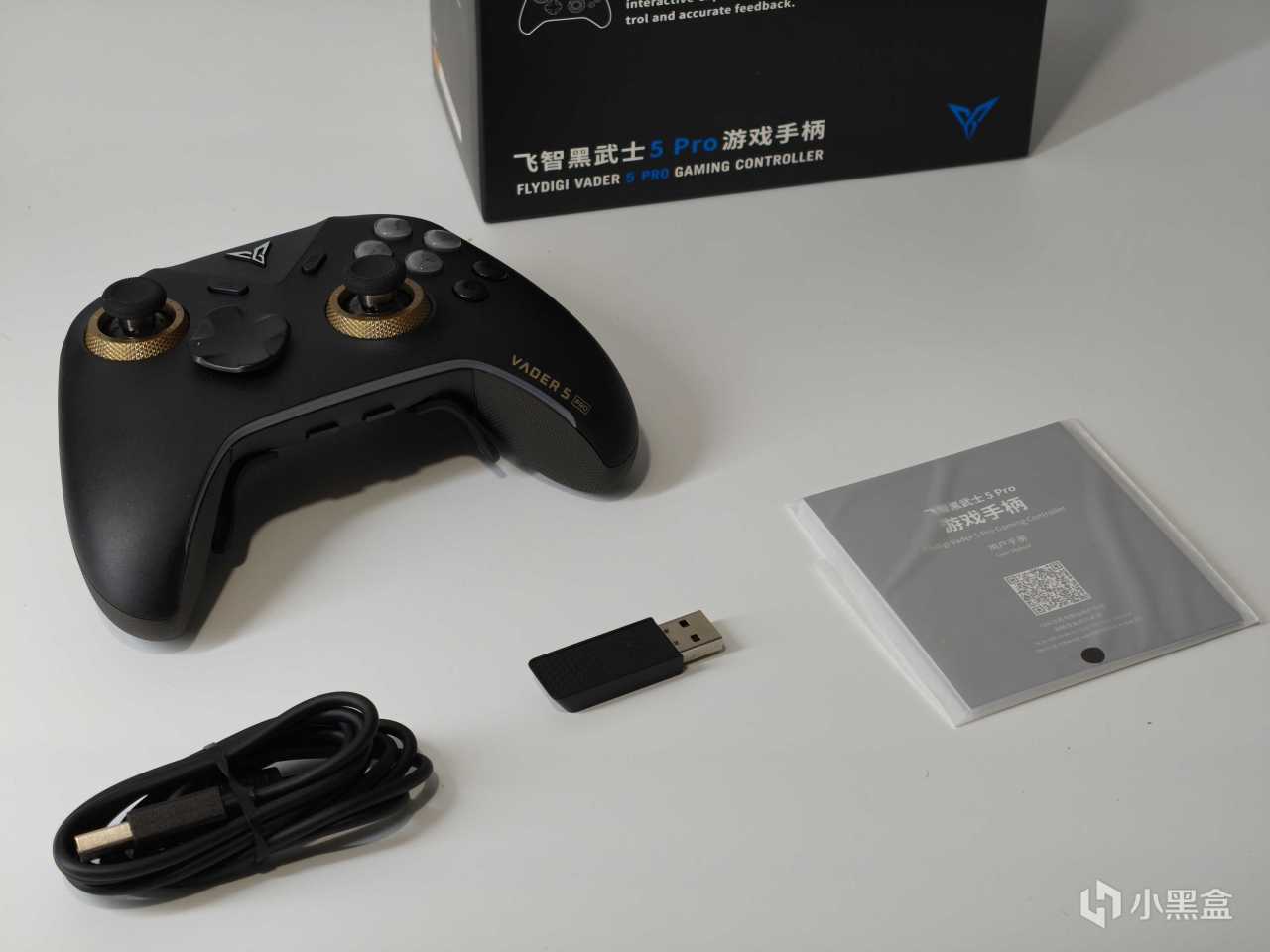 黑武士5Pro包装延续了飞智的家族风格,纯黑盒身白蓝品牌标识简洁大气。配件方面包含:手柄本体、2.4G接收器、数据线、说明书。若想入手底座的话,是需要额外购买2代充电底座。