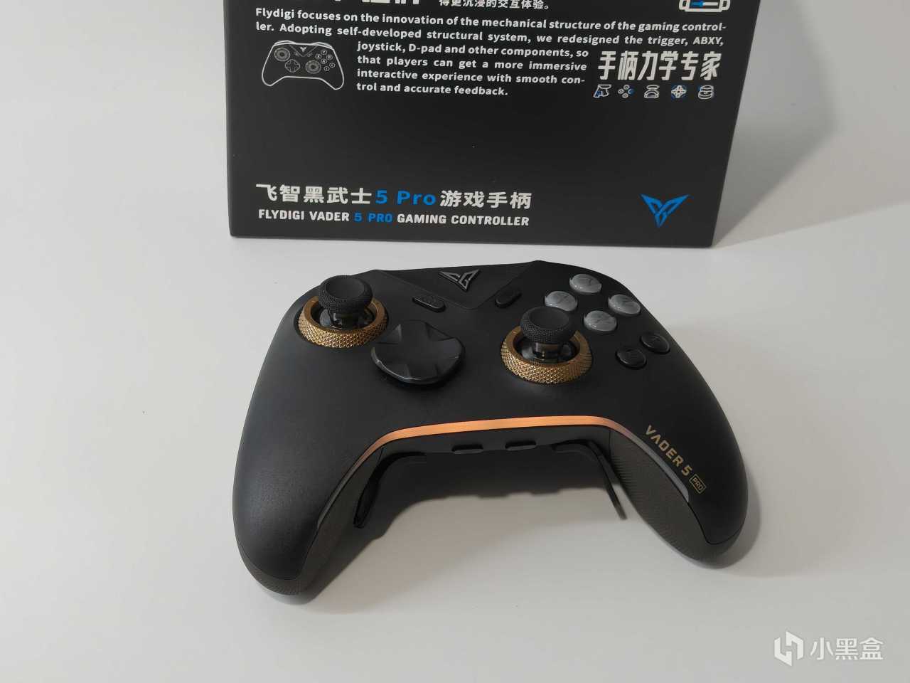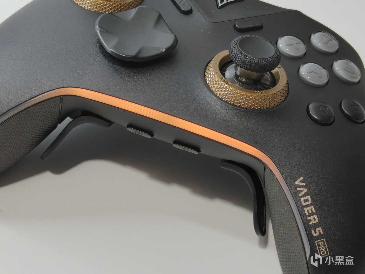拿起手柄相比前代,黑武士5Pro的外观设计改变还是蛮大的,首先是标准版改为了黑金配色,先不说个人审美好不好看,这个整体的质感确实提高了不少,黑金色搭配尤为的耐看。