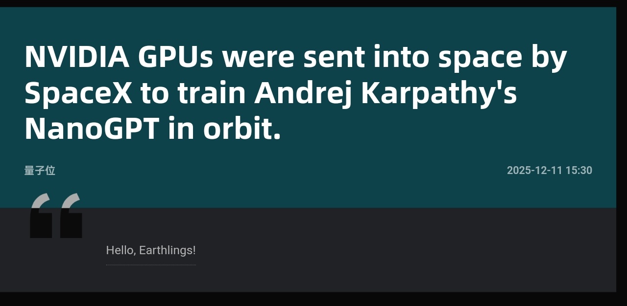 名为Starcloud-1的卫星于2025年11月2日由SpaceX火箭发射升空,其核心搭载了英伟达H100图形处理单元。在轨期间,这颗卫星成功运行了谷歌的开源大语言模型Gemma,并传回了问候信息。同时,卫星还利用莎士比亚全集训练了另一个名为NanoGPT的模型。