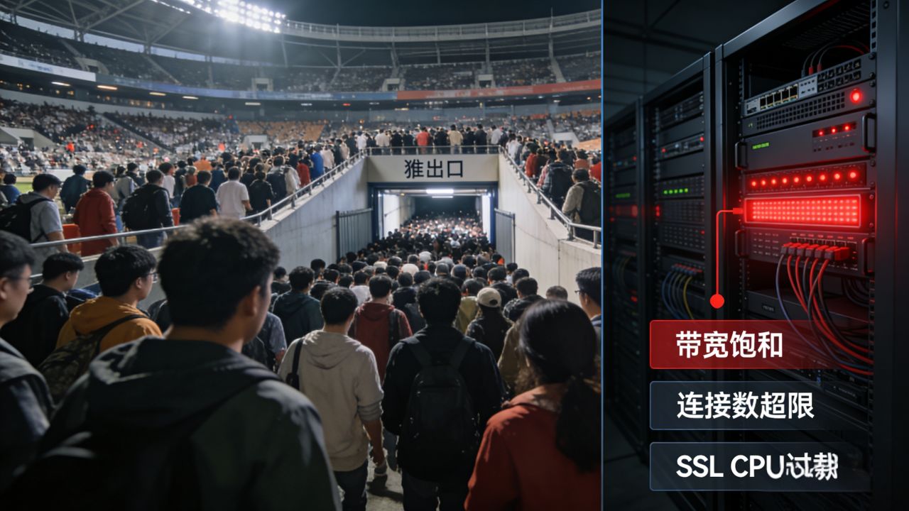 就像体育场所有观众同时涌向唯一出口,网络入口层的负载均衡器最先遭遇冲击: