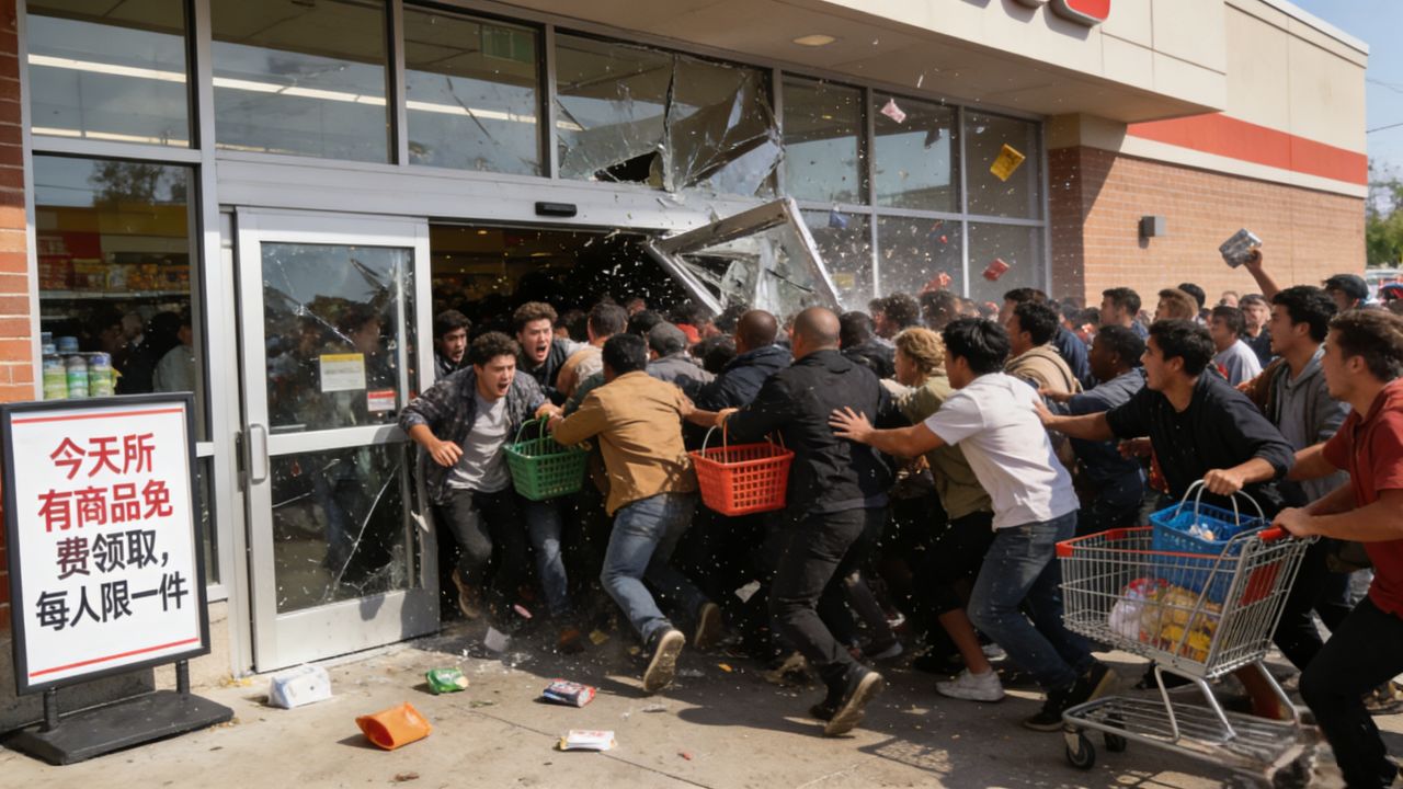 开门那一刻,人群如潮水般涌入——收银台瘫痪、货架被挤倒、连大门都被挤坏了。