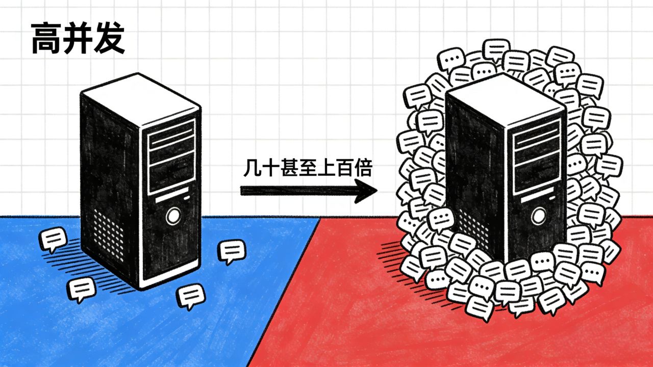 高并发就像除夕夜的短信拜年:平时每秒几百条,零点时刻每零点几秒数十万条同时涌向运营商系统。
