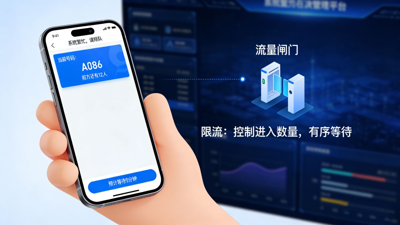1.限流:像点单取号一样,控制进入系统的用户数量,排队系统让用户有序等待而非直接拒绝