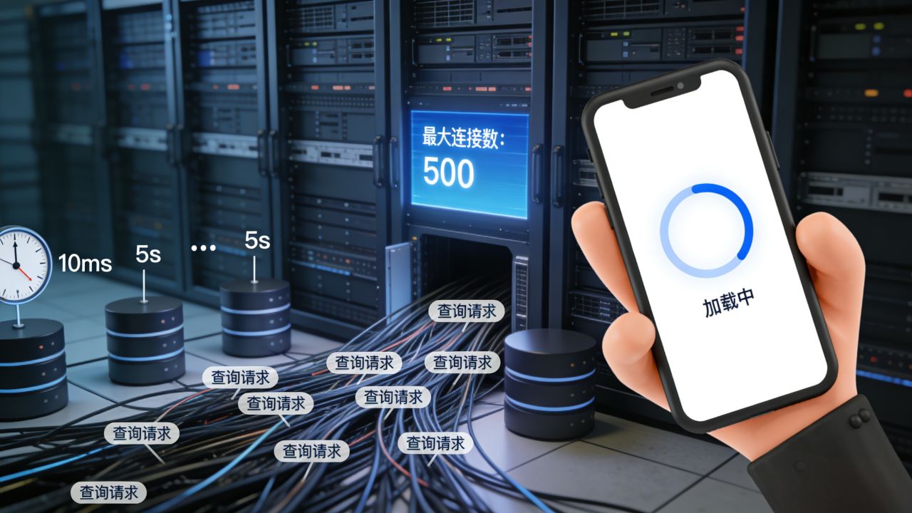 数据库同时处理的连接数有限(通常几百到几千)而每个查询都需要时间(即使简单查询也需10-50毫秒),所以大量查询堆积导致响应时间从毫秒级变成秒级,最后的结果就是前端等待超时,用户看到“加载中”或白屏