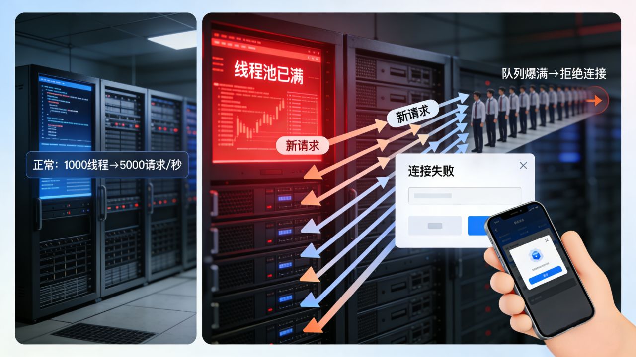 高并发时:1000个线程全部占用 → 新请求进入等待队列