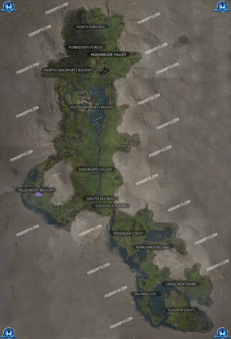 一共有16个地区,分别为霍格沃茨、霍格莫德、北福特沼泽、禁林、霍格莫德谷地、北霍格沃茨地区、南霍格沃茨地区、费德罗特地图、霍格沃茨谷地、南海沼泽、海岸洞穴、波德希尔海岸、马伦威姆湖、庄园海岬、克罗夫特郡、克雷格摩尔海岸。