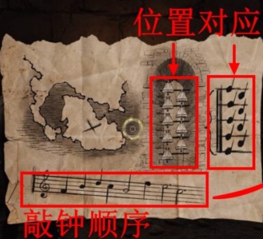 卷轴上的钟图案和右侧音符的位置是一一对应的,下边乐谱上的音符就是敲钟顺序。以下边乐谱上第一个音符为例,这个音符在第4根线和第5根线之间,对应到右侧音符就是右边一列从上往下数第4个,所以第一下需要敲这个钟。(音乐生狂喜)