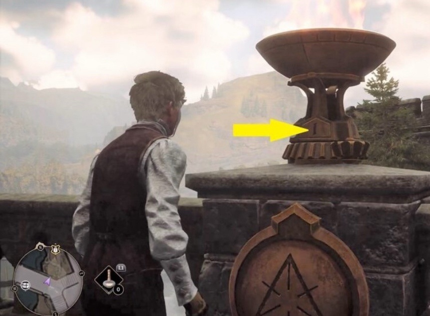 地面上会有一个很大的圆形凹槽,附近会出现一个大石球,用【统统飞走】咒语把石球推进凹槽。