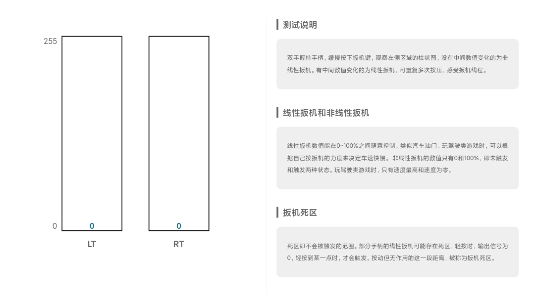 扳机测试可以通过进度条数值变化,检测扳机键的按压灵敏度(比如是否能线性触发)。