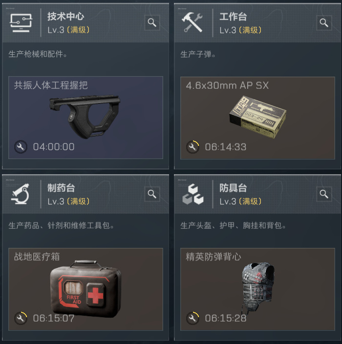 今日特勤处制作:共振握把,金血包,老塞甲,4.6x30金蛋(一日两收)or龙息弹(一日三收)