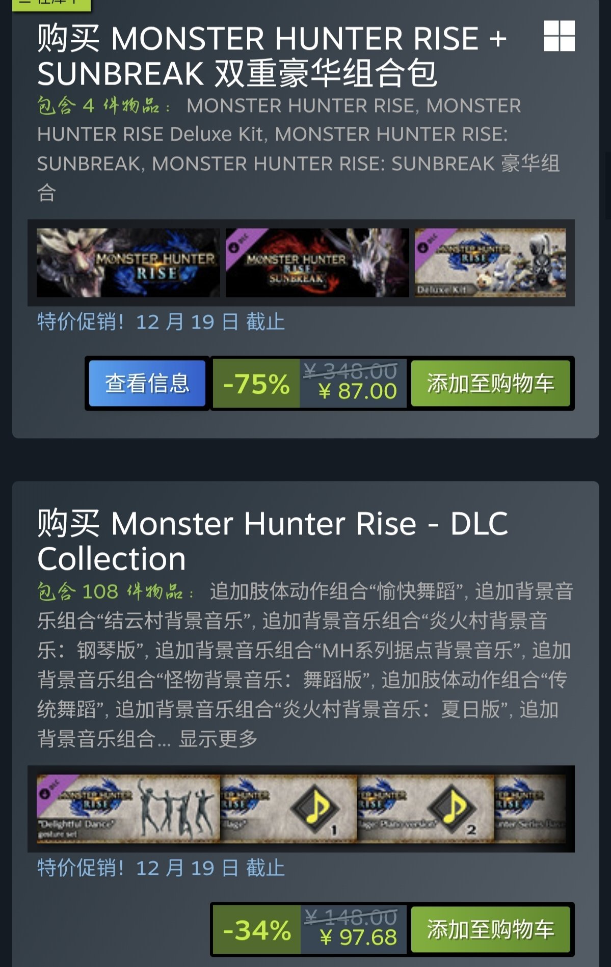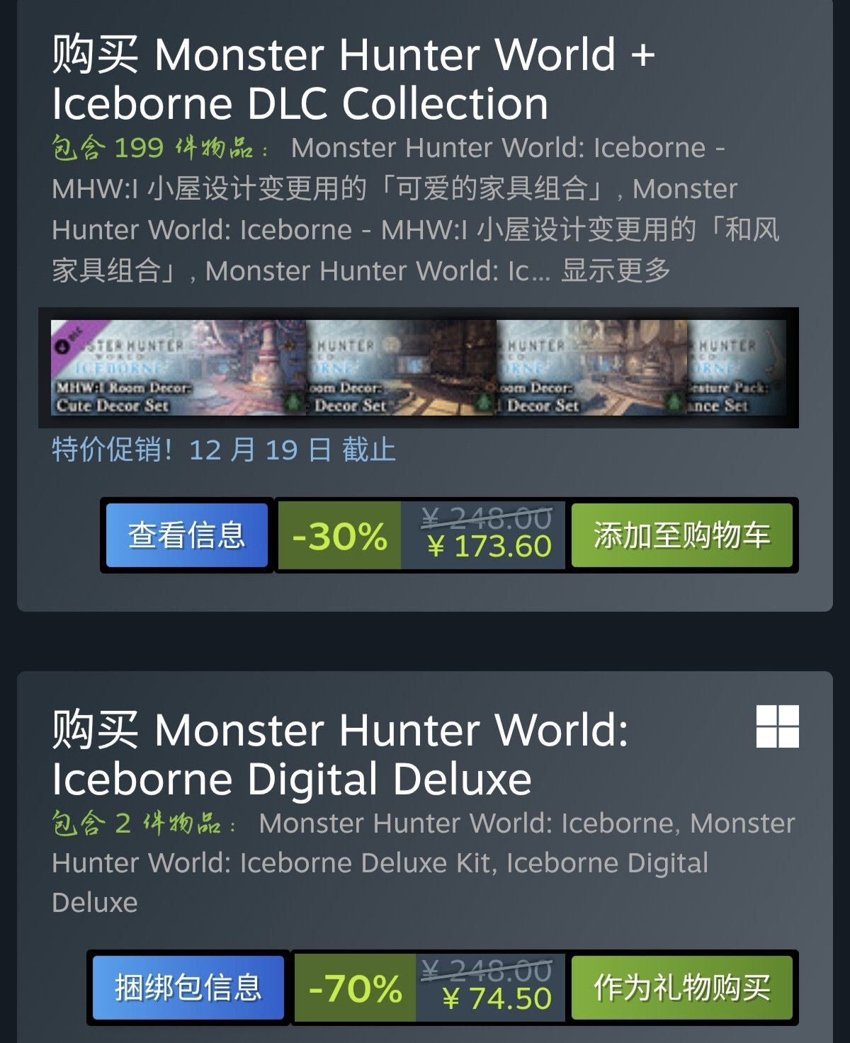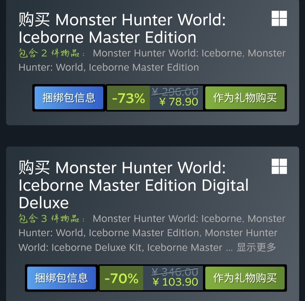 第一个普通版,第二个大师版,游戏本体+曙光,第三个双重豪华版,本体+本体皮肤,曙光+曙光皮肤,第四个豪华版dlc,曙光+皮肤,第五个超级豪华版dlc,曙光+更多皮肤,第六个超级无敌豪华版dlc,曙光+大量皮肤,第七个可以送好友的大师版,第八个怪物猎人大包,世界+冰原,崛起+曙光,物语1+2普通版