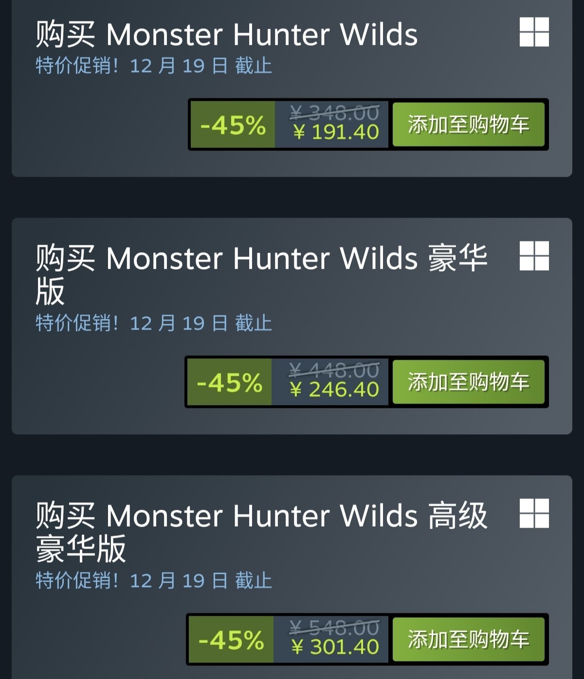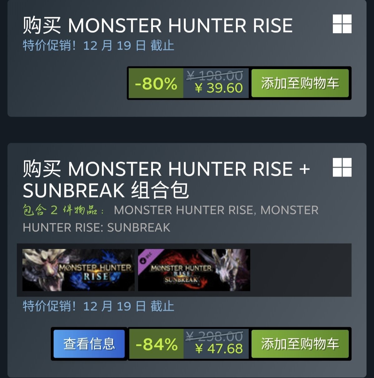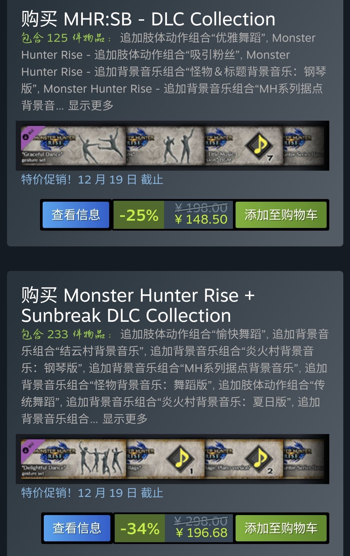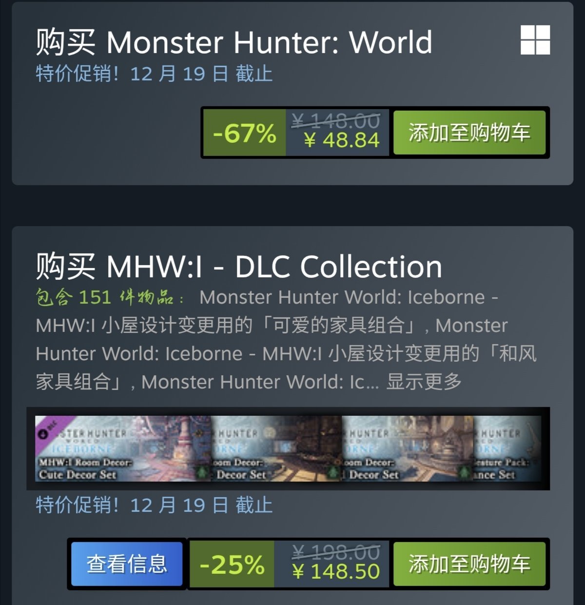 第一个普通版,第二个大师版,游戏本体+曙光,第三个双重豪华版,本体+本体皮肤,曙光+曙光皮肤,第四个豪华版dlc,曙光+皮肤,第五个超级豪华版dlc,曙光+更多皮肤,第六个超级无敌豪华版dlc,曙光+大量皮肤,第七个可以送好友的大师版,第八个怪物猎人大包,世界+冰原,崛起+曙光,物语1+2普通版